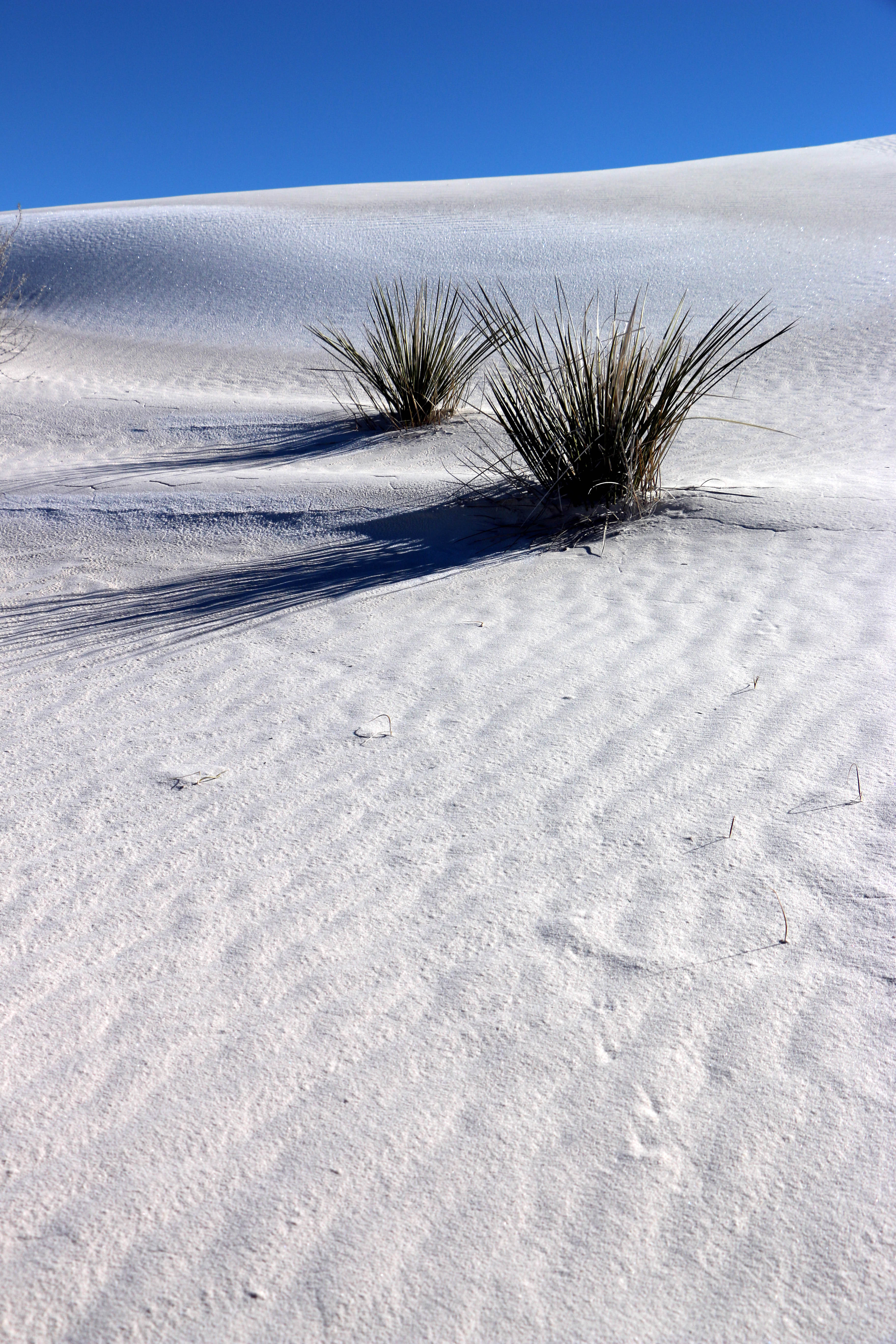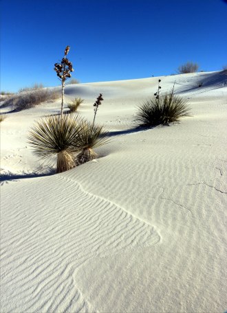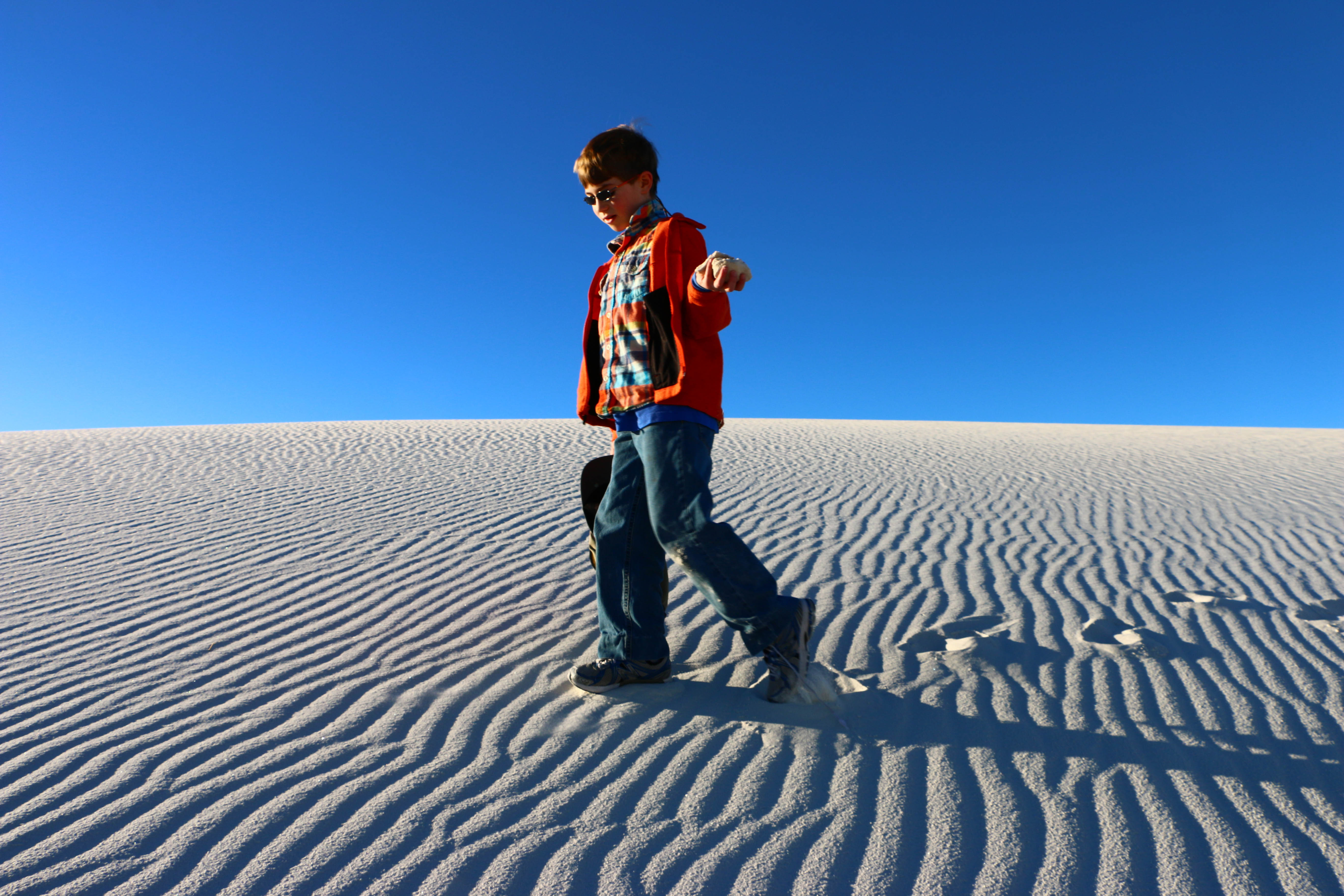 The major issue faced when photographing this white sand is getting your exposure right. Yes, in the morning and afternoon I did use a polarizing filter on my lens. We entered the park not until 2 hours after sunrise; I was traveling with young children and we first stopped in town at the Waffle & Pancake Shoppe for a hearty breakfast; then the kids pursued Junior Ranger booklets at the visitor center after watching the informative film. We drove in, and were blessed with a cloudless, sunny day. Great for hiking around. Less so for exciting photographs that include sky. I removed the filter an hour before sunset when it was no longer necessary and the softest colors were present, even as the shadows elongated.