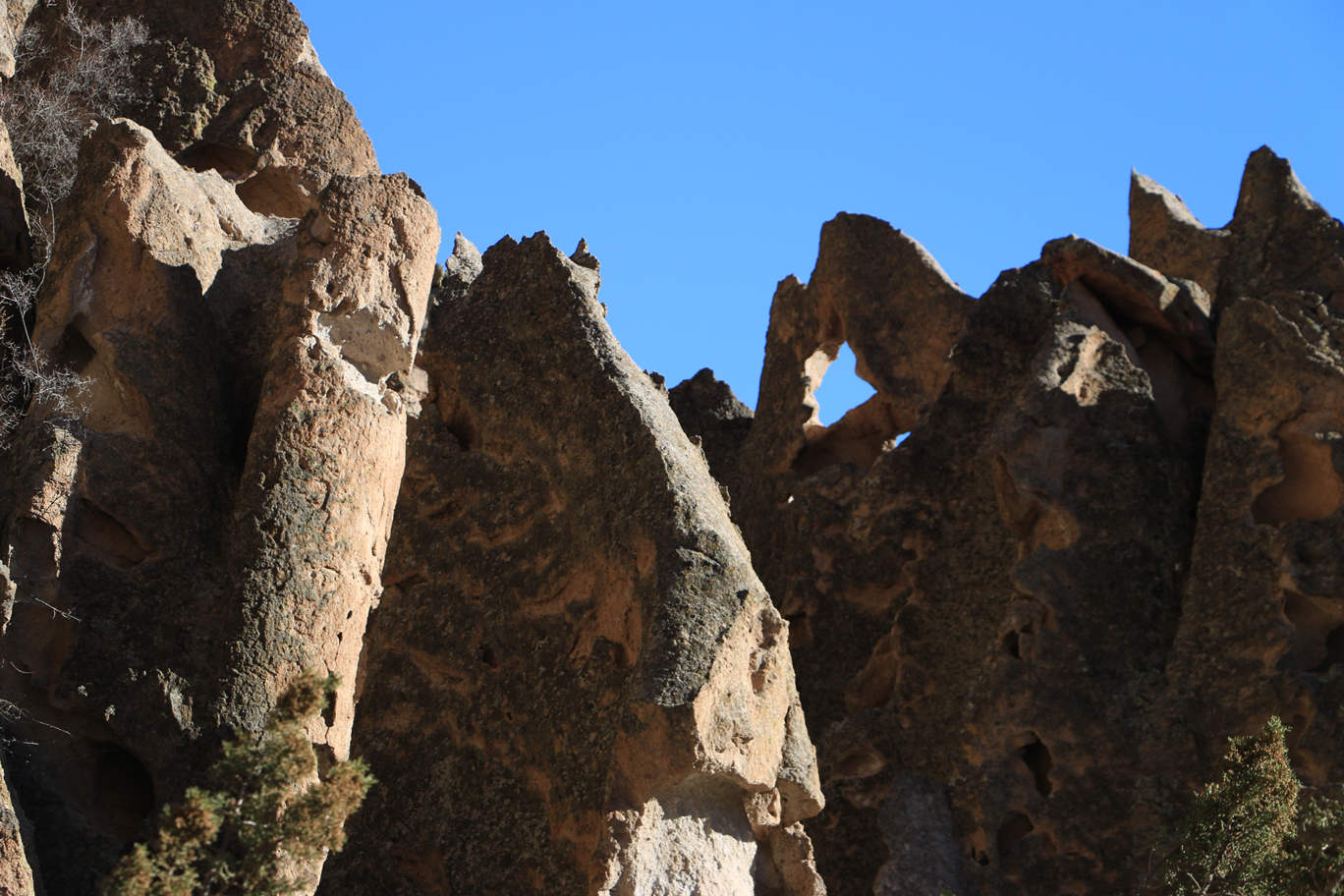 The Jemez Volcano, 14 miles northwest of the park, twice exploded more than one million years ago. The park service reports that each explosion was six times more powerful than the 1980 eruption of Mount St. Helens. Geologic material spewed over more than four-hundred-square miles from this earthen activity. It formed a layer of volcanic ash that was up to one thousand feet thick. Over time, this material compacted to become the pink rock that is called “tuff.” Wind and rain erode the material creating an appearance that is like Swiss Cheese. The holes on the cliff faces were enlarged by the people who used them in dwellings built along the cliff faces.