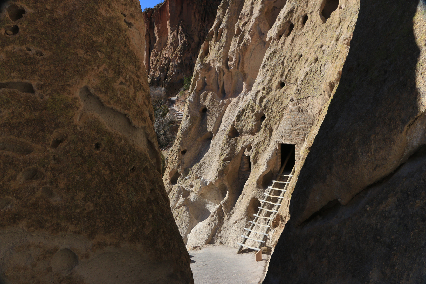 If disinclined to traverse 70 miles of rugged, high-altitude back country, one can enjoy simple trail walks that depart from the visitor center and make a two-mile loop. The main loop in the Frijoles Canyon allows a visit with archeological remains, cliff dwellings, caves, kivas, and petroglyphs. There are some narrow footpaths and several opportunities to climb up ladders into cave dwellings, and cliff dwellings. At the end of the loop, those with a sense of adventure and who lack vertigo can attempt the 140 foot vertical climb up (and down!) four long ladders that reach the “Alcove House.”