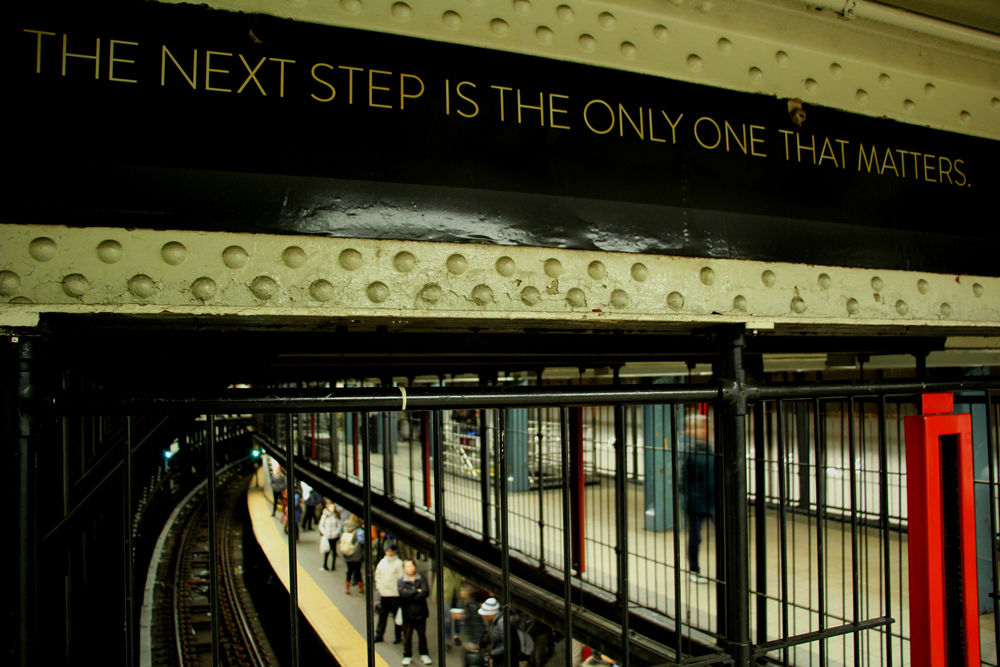 With this final photo for this assignment, I played around with the angle that I took this picture; for two reasons. The first is that I need to learn how to better adjust my positioning when there are reflections. Since I don’t have photo editing software, what you see is what you get for now. The reflection from the florescent lines were annoying me. Then, the second reason – and the one related to this assignment – when I turned the angle a bit, I started to feel as if the music was moving out of this mosaic man’s saxophone. This was taken at the 86th street stop, heading downtown.