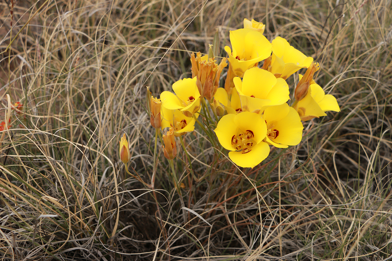We pulled out of the Blue Mesa Badlands, packed up again into the minivan, swigged some water and aimed southward on the main road. Right after passing the exit for the Jasper Forest, I saw some yellow wildflowers in the road. I backed up, parked on the road shoulder and crept gingerly into the thicket of grasses to photograph them. They had three petals, were vibrantly yellow, and were between 10-15″ above the ground.