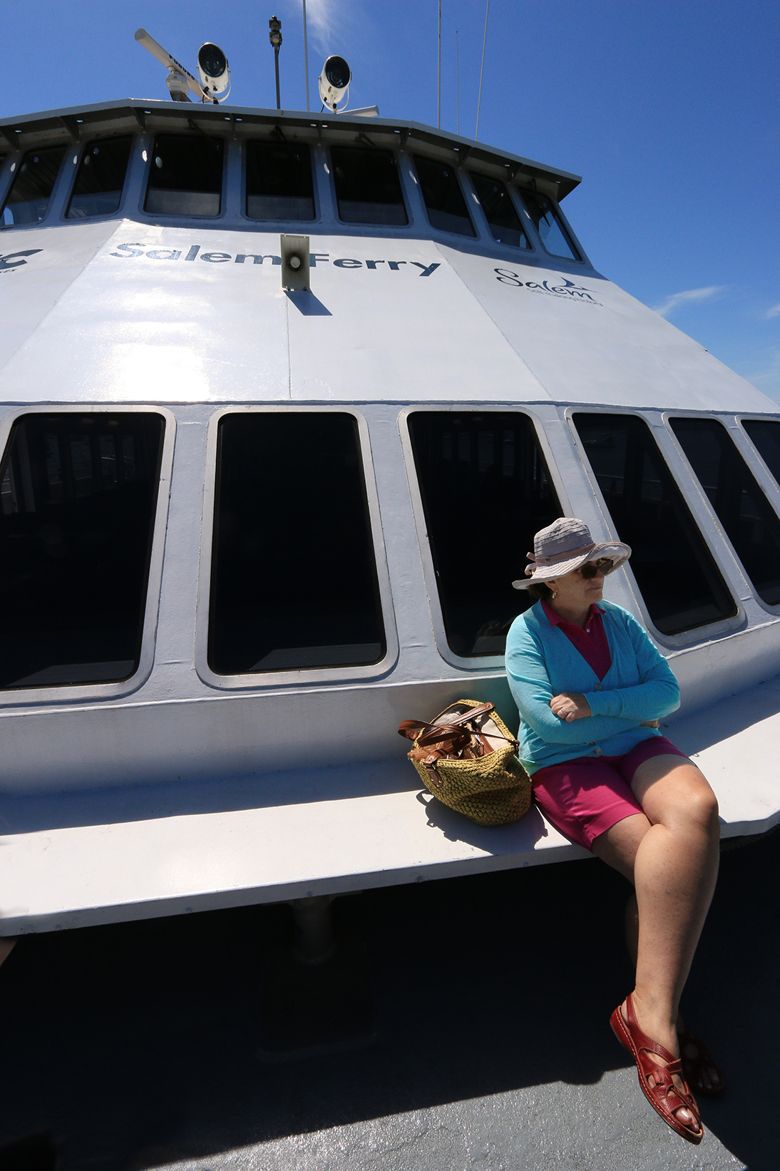 While we waited for the Ferry to arrive, I experimented, without my tripod, and snapped enough shots to composite a 360 degree panorama. The sky was so blue; the gangplanks were empty; the railings were shiny; there were boats  moored in Salem Harbor; mom was boldly dressed in hot pink and game for a photo. This was the first time I’ve executed this type of photograph digitally.  The results were pretty cool; at least I think so. I think I’m hooked on making 360s.  If anyone has tips on how best to obtain reasonably priced, quality large prints of their panoramas, I invite you to leave us comments, please!