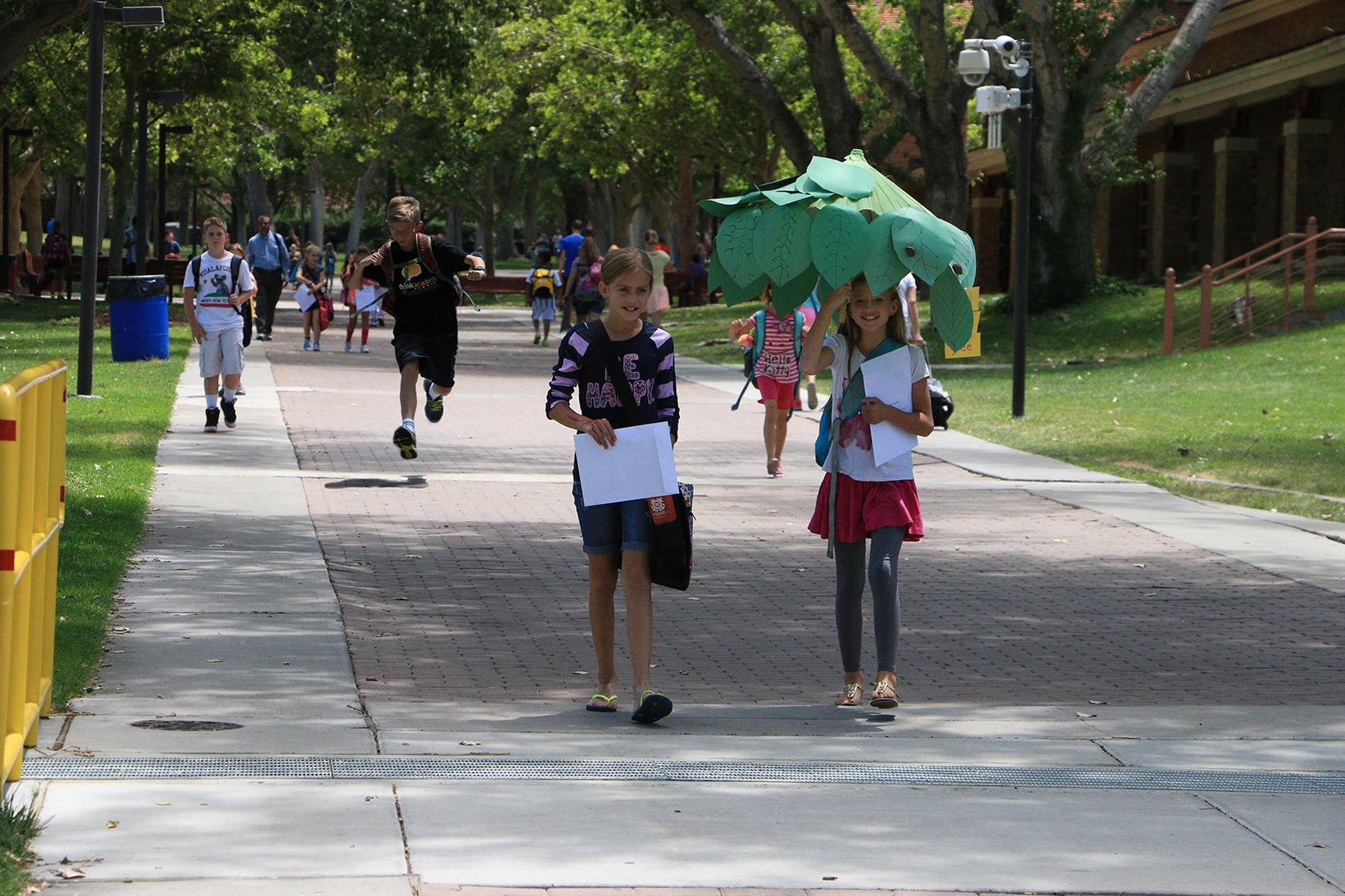 I was carrying my camera with me this time. Students in summer classes were transitioning into lunch period after enrichment courses. The girl with the green umbrella was walking erectly and smiling. As she passed me, she boasted that she had decorated the green tree parasol all by herself.