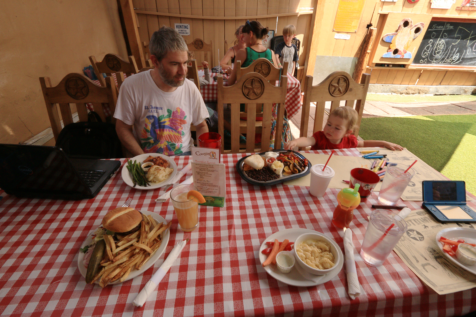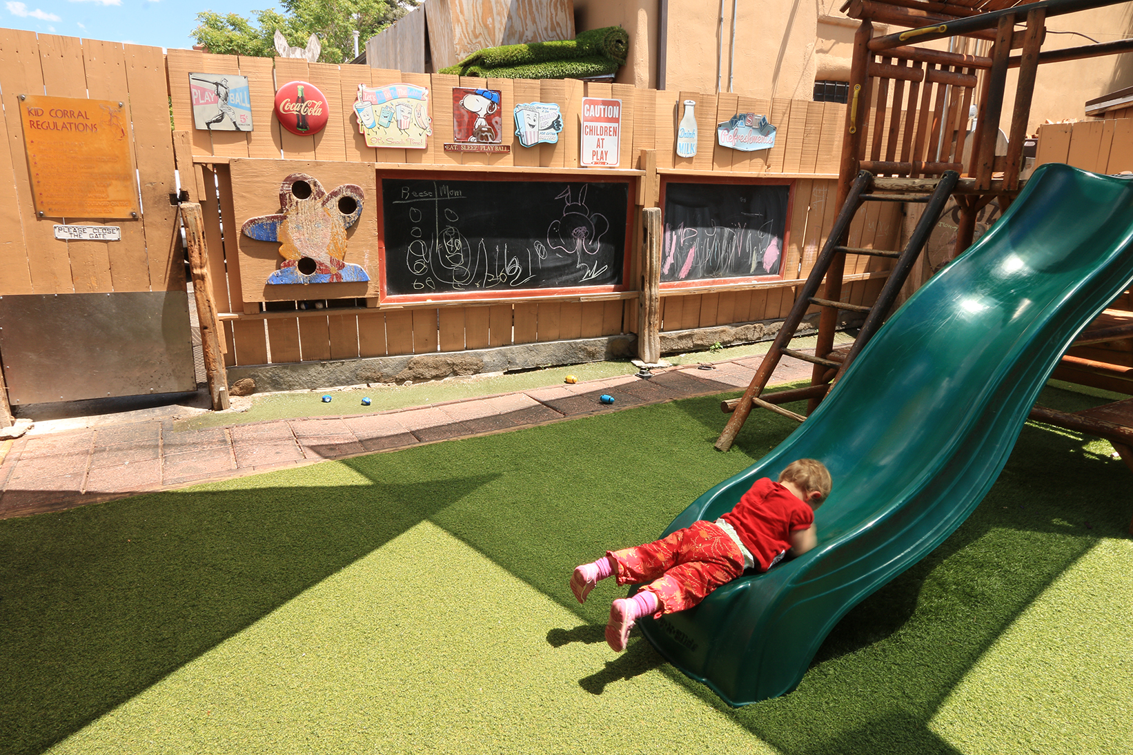 Usually we are seated in an area near the bathroom (it has an infant changing table). The space is filled with cowgirl themed photos and memorabilia. In our last visit, however, we were led to the back outside patio, which held a huge surprise for us: The Kiddie Corral. Dining al Fresco under a shaded cover is one of the lifestyle pleasures in New Mexico. Here, you can get it, AND a playground, too.