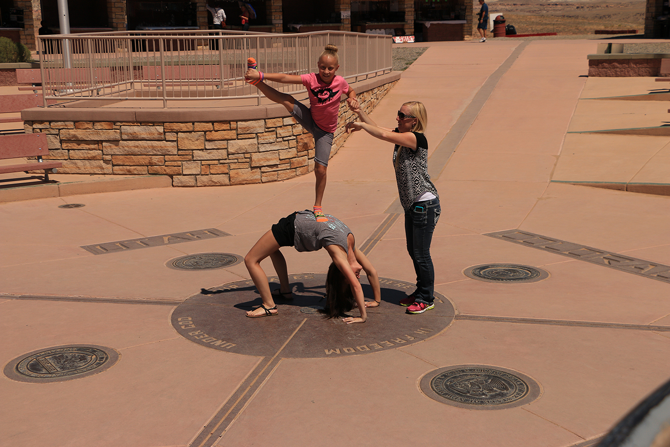 We couldn’t top a back-bending, split-hoisting pair of teens with a mom for a spot. We did manage to make sure all were in different states at the same time, yet with each other.