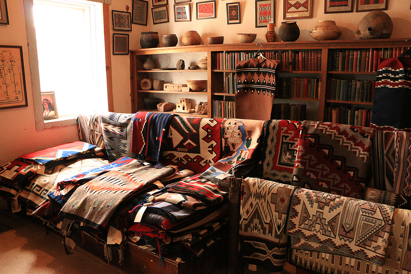 The shop is a melange of museum and active commerce. One starts out inside the mercantile for dry goods, and can then move into a room filled with handmade Indian folk art crafts for purchase, such as baskets, belts, pottery and jewelry. Moving still deeper, one arrives at the sanctuary to Navajo textiles. The rug room holds historic relics, as well as textiles predominantly produced by Navajo artists, arranged by their various clans.