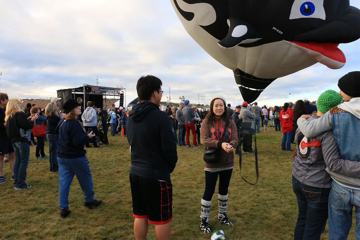 I enjoyed the moments observing people wearing costumes, adorned in silly hats, boasting collector pins, outfitted in clothes that mimic patterns on hot air balloons. There was abundant opportunity to click when people were texting on their phones, gawking at balloons and shooting photos, shivering in the cold, chasing after children, performing all sorts of jobs, directing balloon launch traffic in zebra striped costumes. I aimed at the awkward and the honest. It was irresistible!