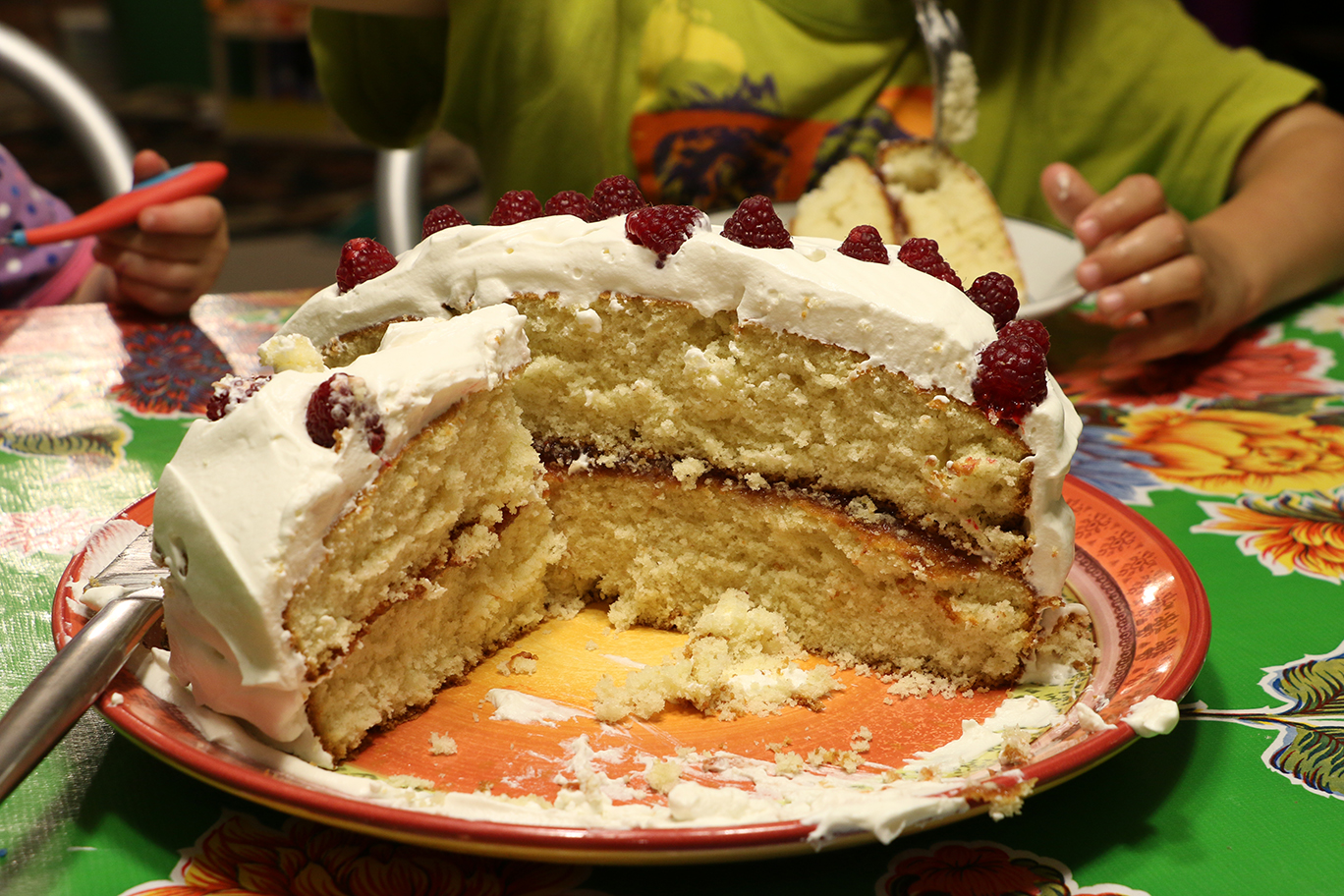 In the first image I used soft focus on the strawberry jam being used to fill the cake. My boys think this looks like a virus under a microscope. I just enjoyed the dancing light.