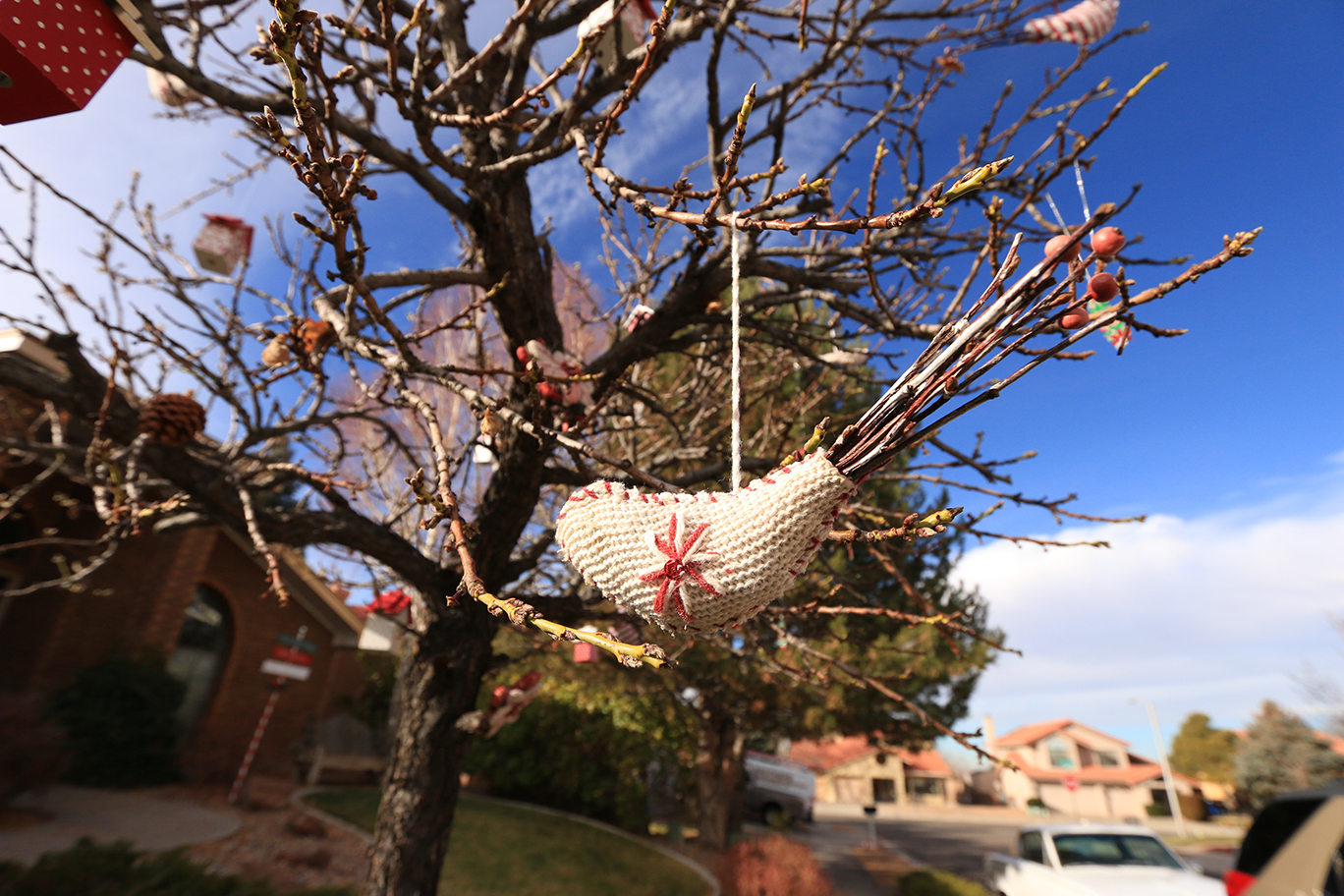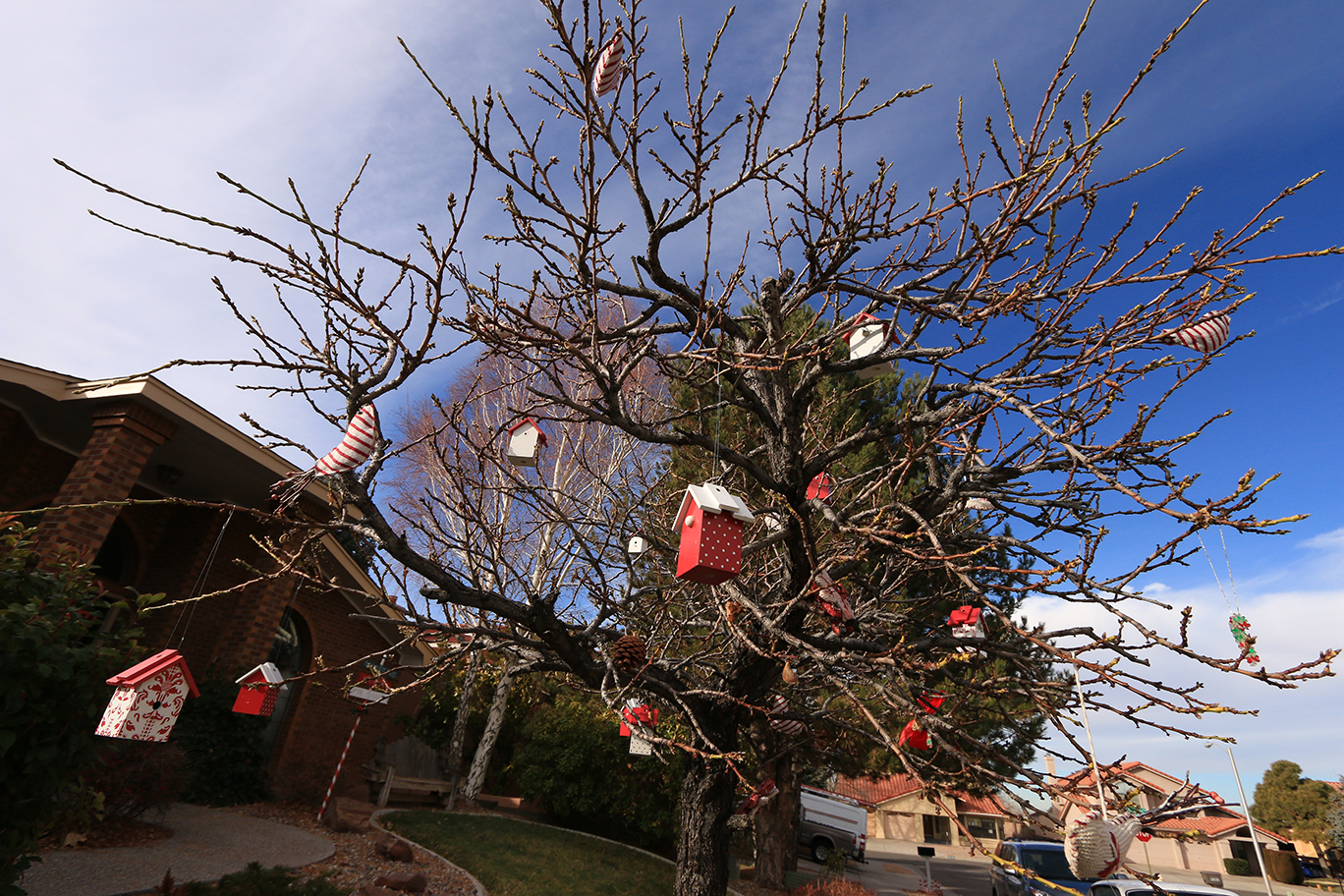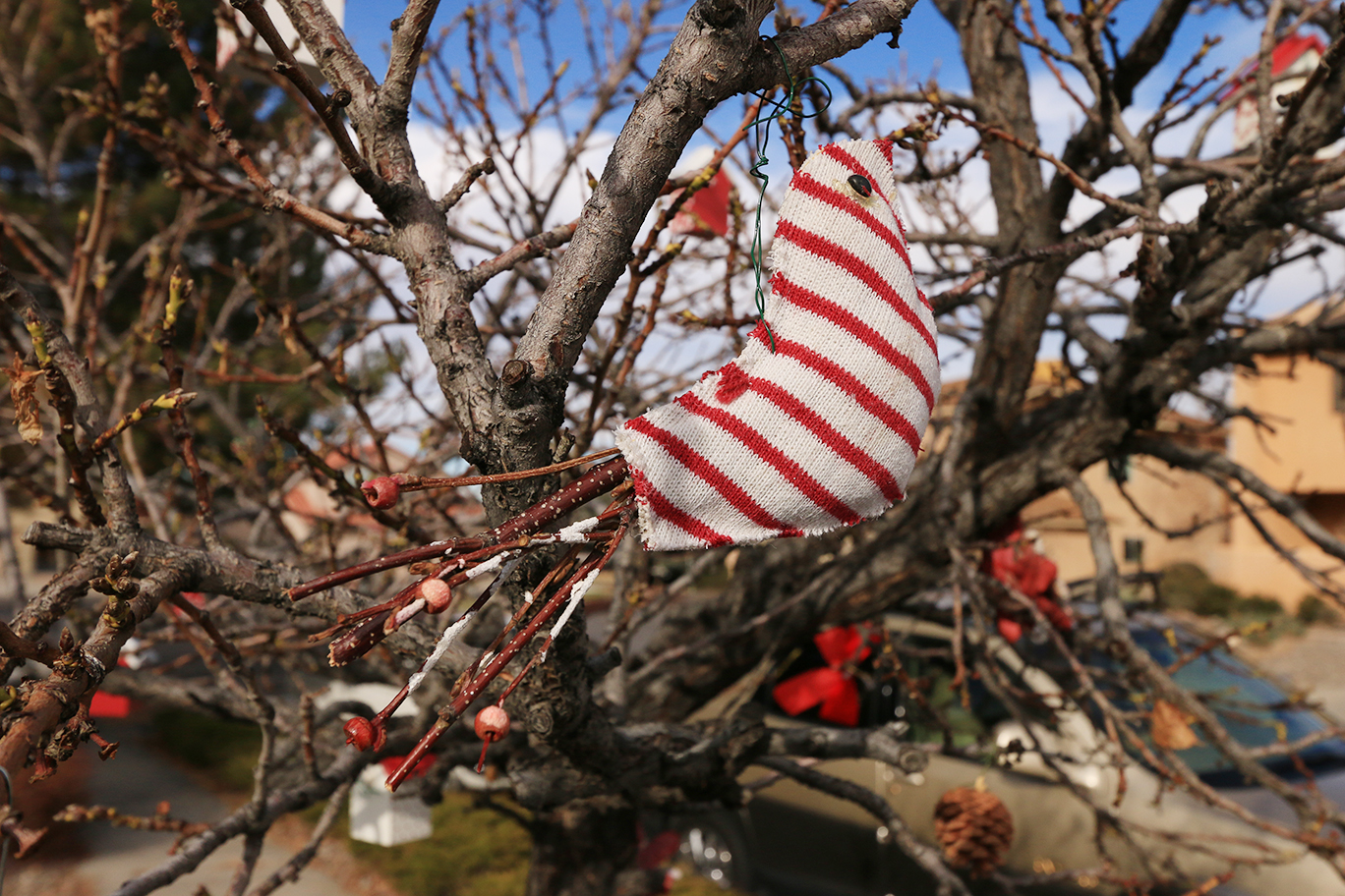 Some people beat to their own drum. That’s the case with one of my neighbors. Selena’s front yard is now decorated for Christmas. Most homeowners have been setting up inflatable snowmen, mechanical waving Santas, head-bowing electronic LED reindeer and imitation paper-bag luminarias. You’ll find none of that in front of Selena’s house. She has decorated a small tree with a whimsical collection of tiny ornaments in red and white: painted wooden birdhouses and twig-stuffed, knitted birds. I haven’t seen many holiday displays like this around here, so I had to capture and share it. I adore the folk-art knitted birds.
