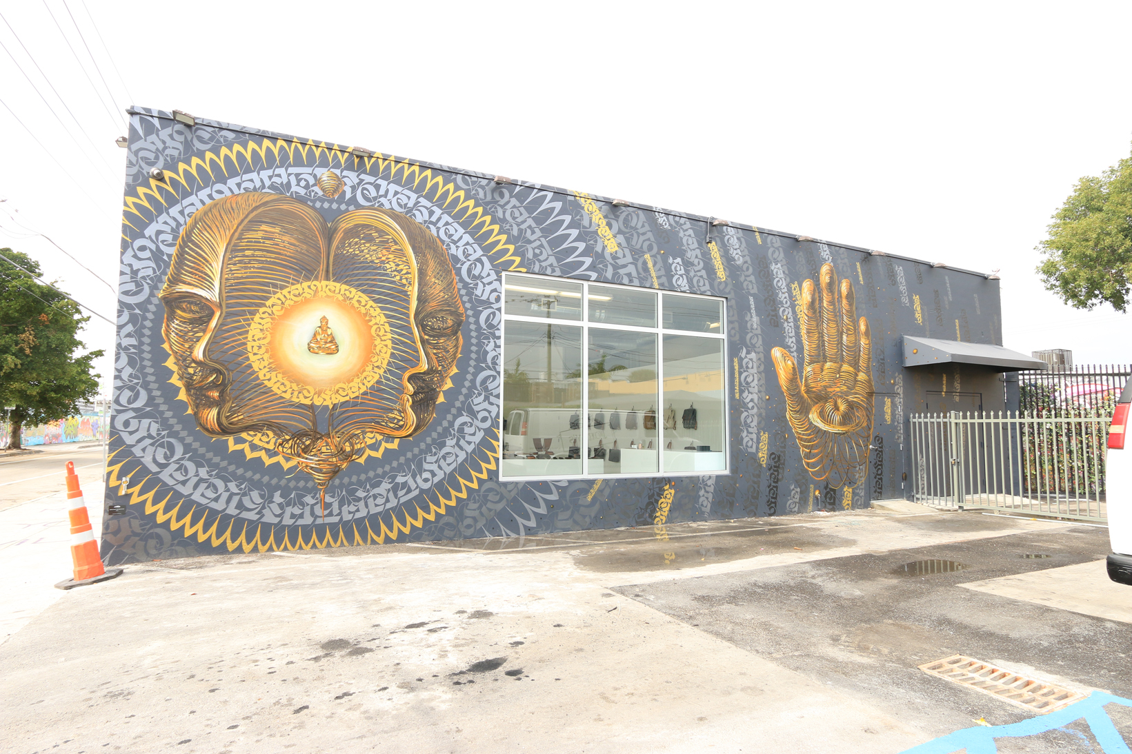 Outside the Wynwood Walls, but around the corner and backing up to it, was this building. My initial response to the circular design and grey and gold paint was that this was a laundromat. As I drew closer and looked through the laundromat-sort-of-ground level window, I was surprised to see designer backpacks on the inside walls. With everything being closed for the holiday I didn’t have a chance to go in browse.