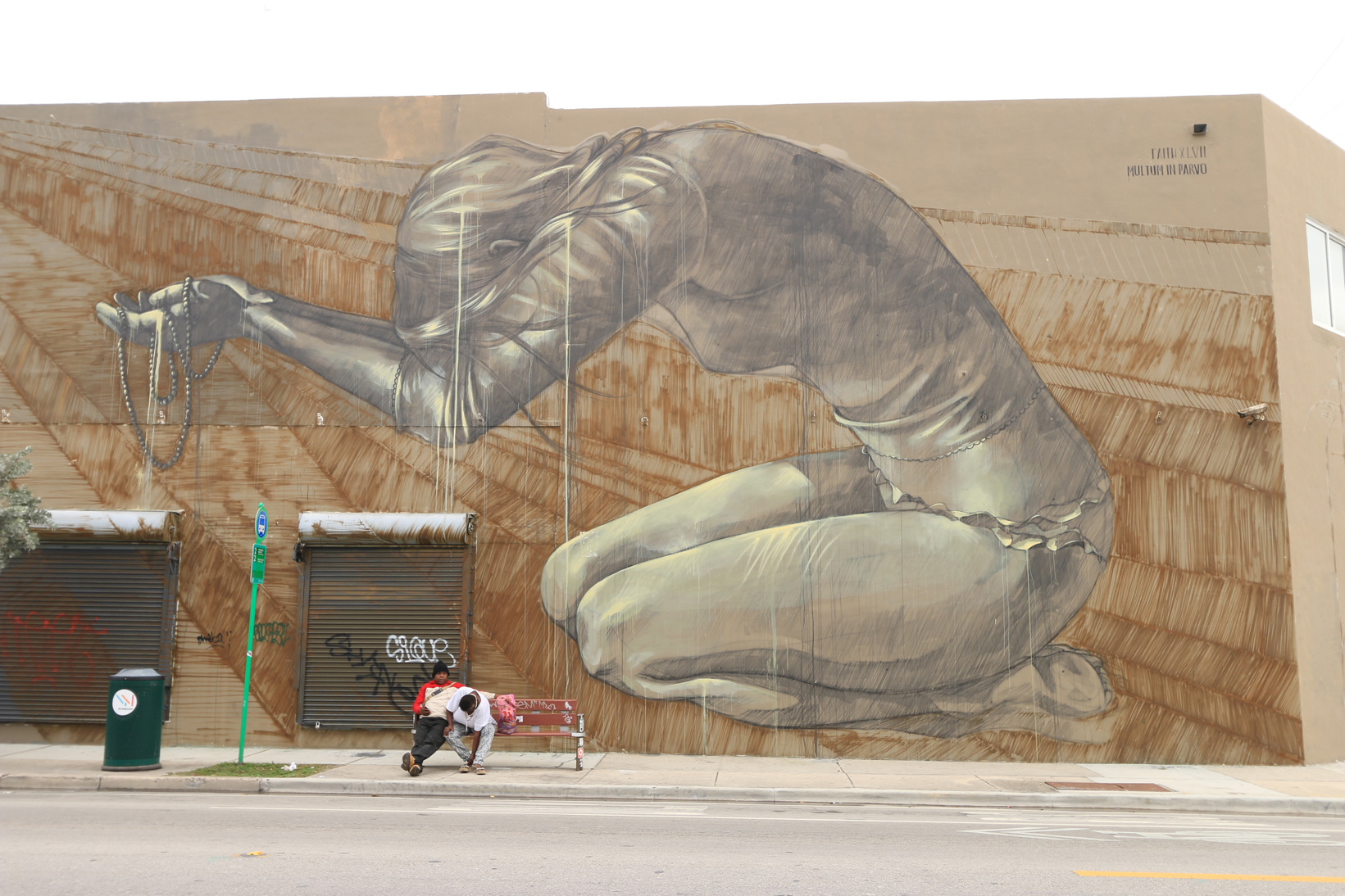 When Wynwood characters were included in my image, their human dimension made the image stronger. Shown in today’s post is Artist Faith47’s artwork, titled: “Multum in Parvo.” That is Latin for: “Much in Little.” The couple in the frame functions as my Little. They represent the human condition while also providing the key to the monumental size of the painted mural.
