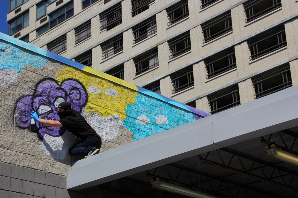 The folks at Green Villain take a different approach. They partner up and appear to be more “on the books” when developing public art projects. As a result, I recently watched a new installation go up and saw some faces behind the sprays.