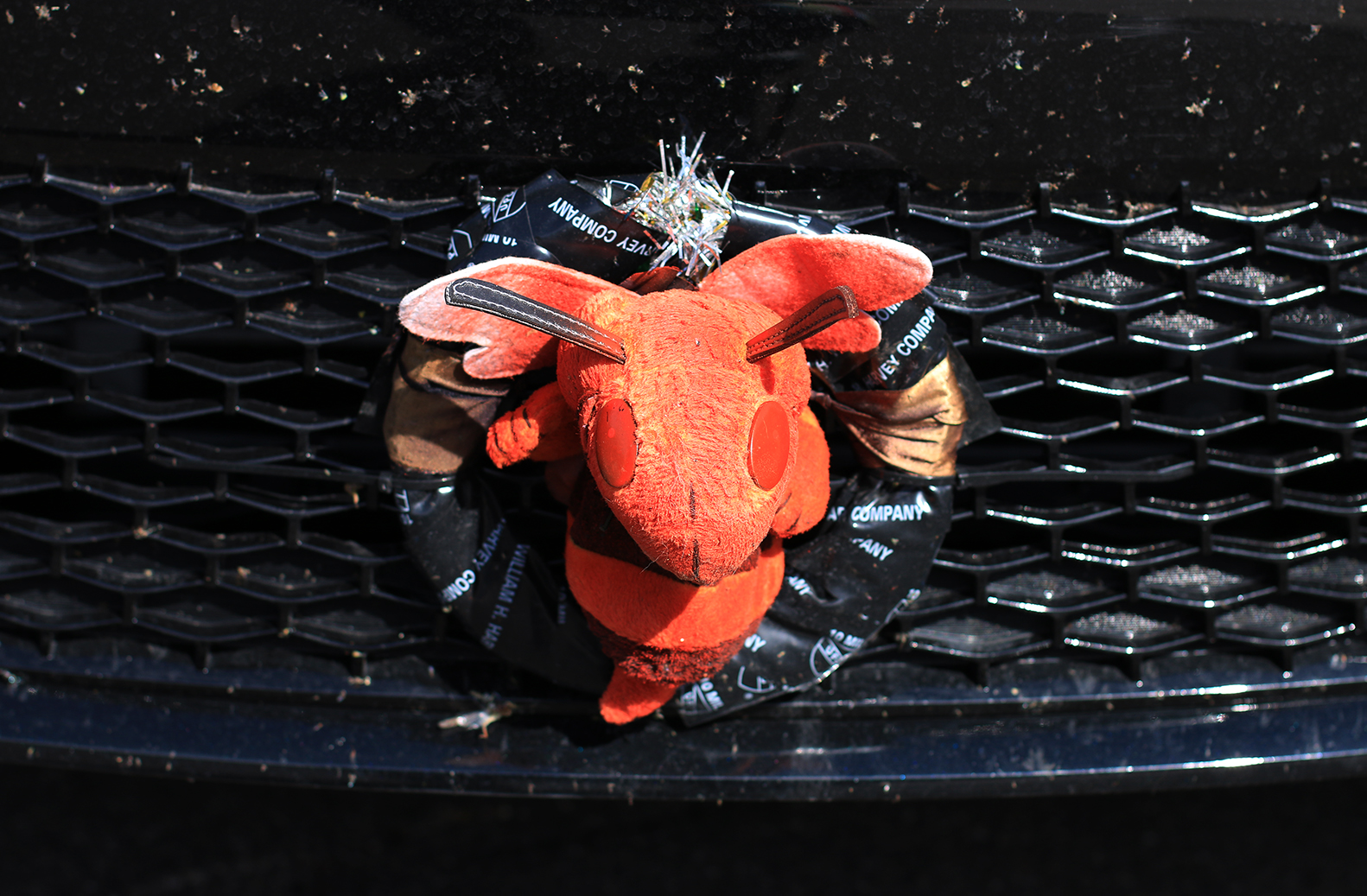 Some superstitious people will hang a stuffed animal or toy from a vehicle bumper or tow loop. It’s a way for them to show respect to the spirits of people who have died on roads as a result of car accidents. The spirits are placated by the object so they don’t cause the vehicle’s driver mischief or harm; such as another car accident. So this orange bee is a good luck charm.