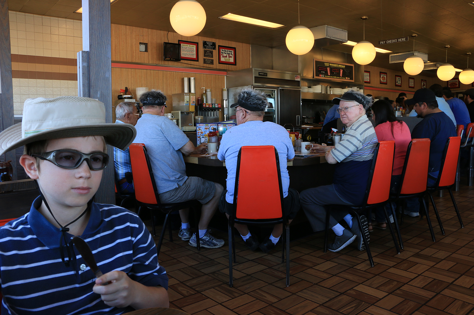 The buddies were all bald old timers wearing matching visor hats that were topped with fake hair. What fun! As I focused on the three of them, my son slid on his bench seat into the left corner of the frame. At the same time, the member of the Waffle Gang turned his face to the side for a grumpy profile. That was my magic moment. SNAP.