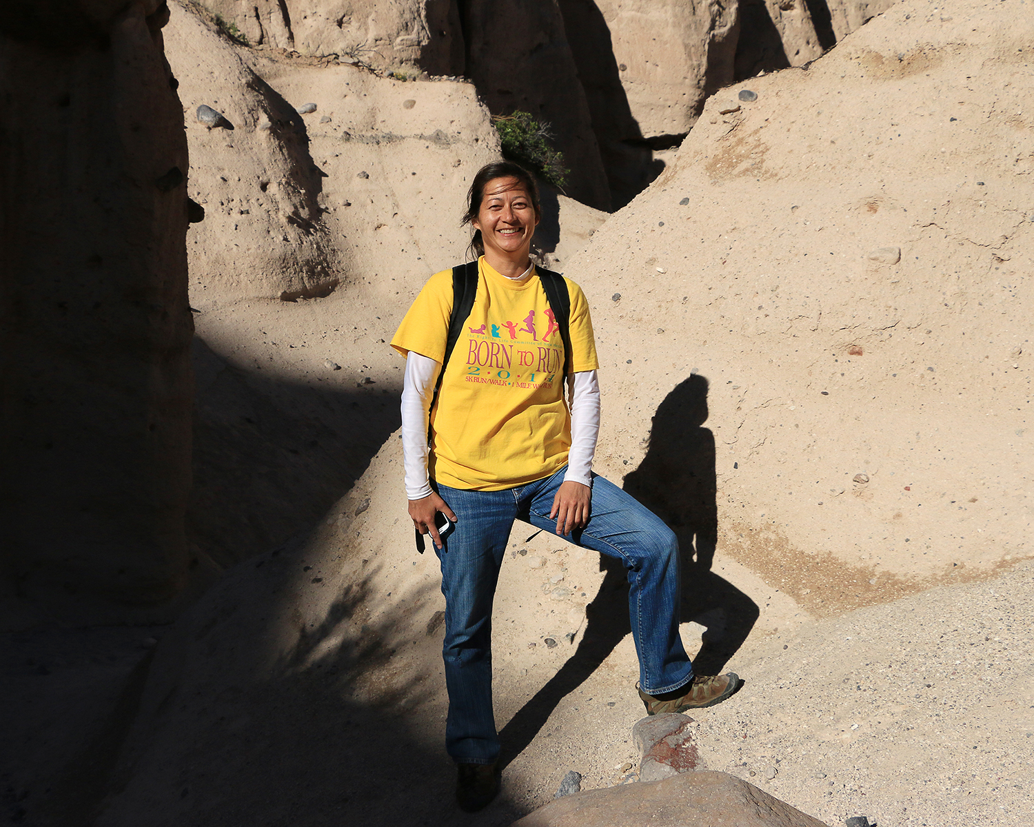 During the descent, we arrived at an area where light was burning between some rock formations. I directed her to stand with her foot resting along a canyon wall. I thought the background offered a suitable context for our encounter. The sun was streaming from on high and the side. It cast her shadow spirit on the wall. Cindy was born to run. It even says so on her T-shirt.