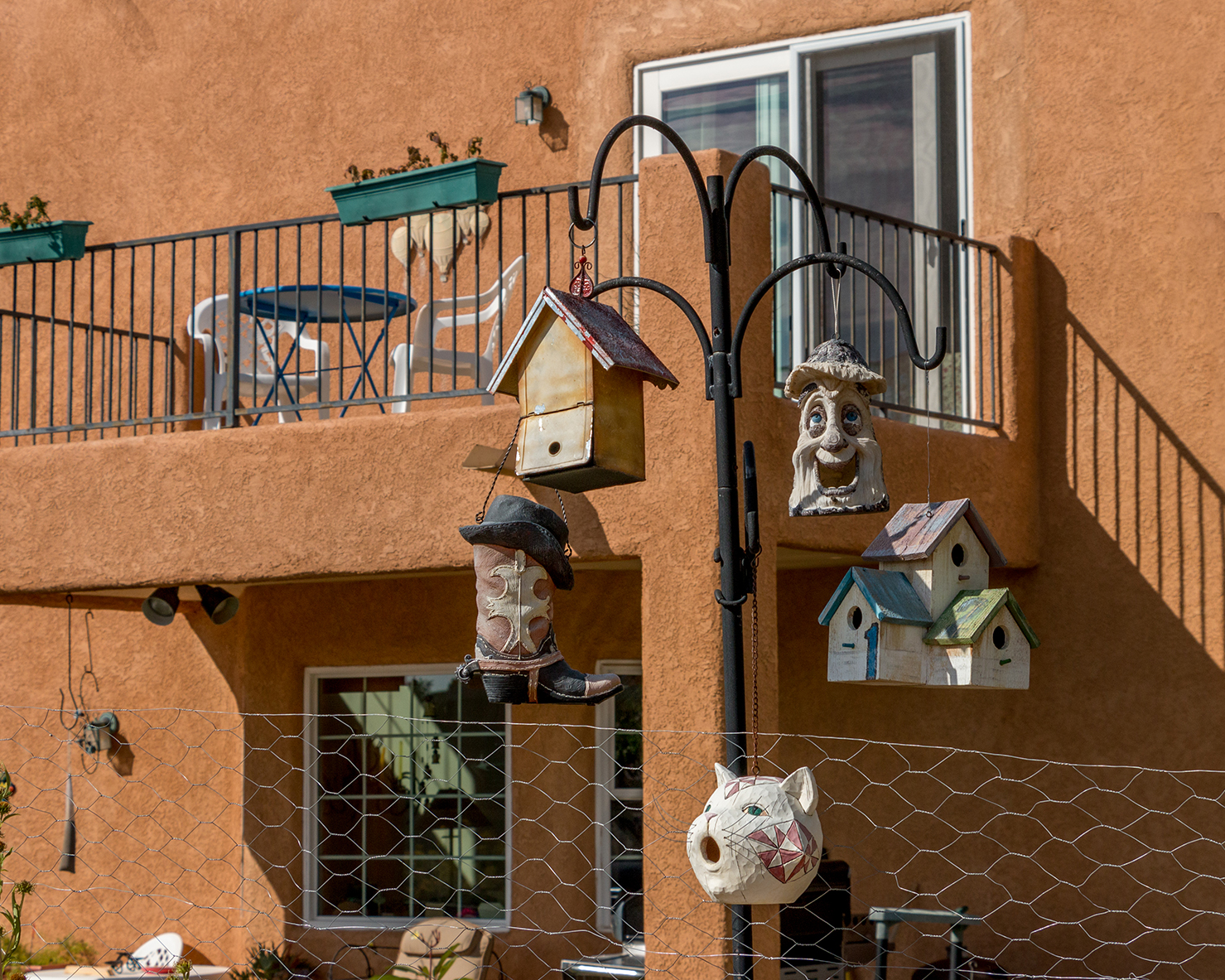 The homeowner has the bird house collection facing the arroyo path. Though the hanging houses are for the birds, the amusing decorations are most certainly for the people.