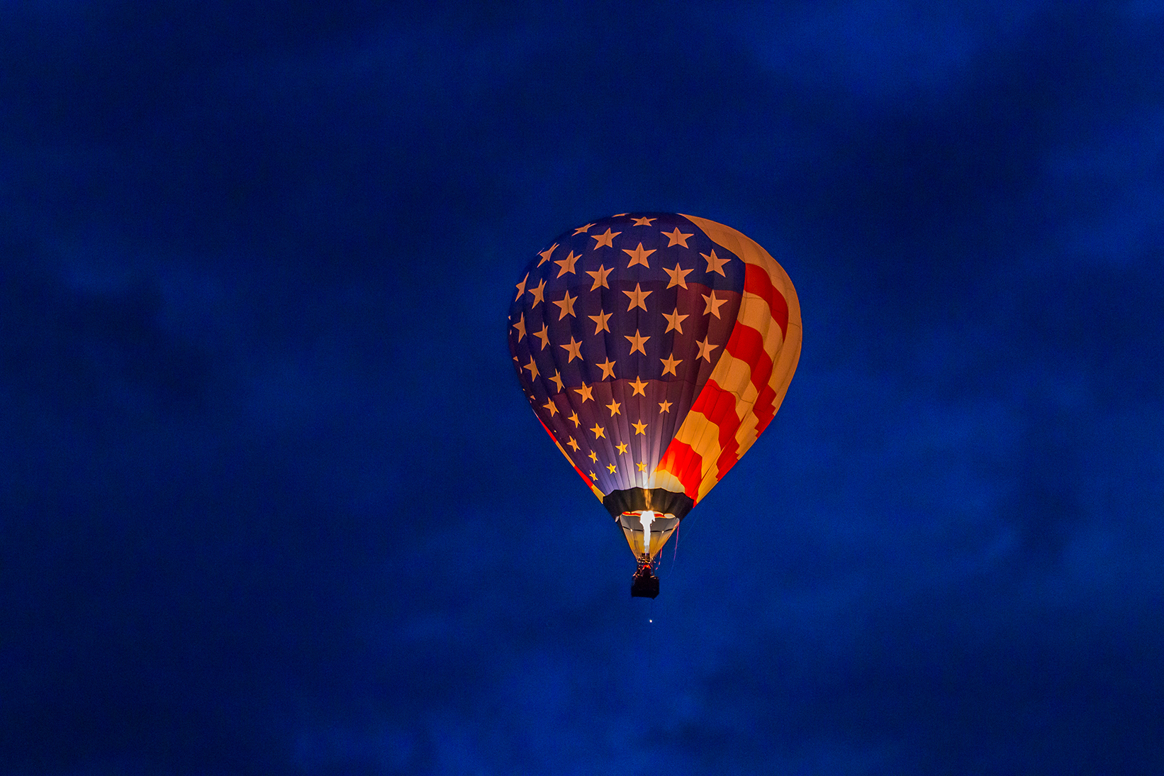 A closeup on the large star spangled banner hanging from the lead balloon’s basket. — 1/800 sec at f4.0, ISO 2500 | Canon EF 70-200mm f/4.0 L IS USM