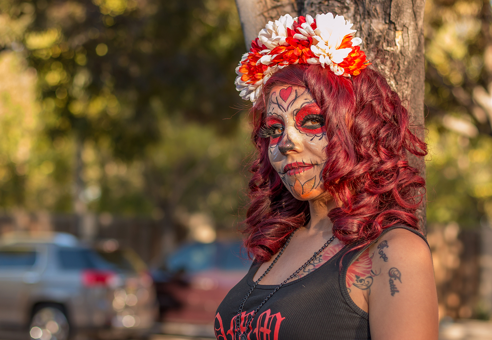 Like many of the women at the event, Linda, my 83/100 strangers, wore a headpiece made with fabric flowers. Out of the frame, dangling around her neck is a large cross and she is also wearing a black lace corset outside her black tank top. On this particular occasion she was a glammed-up calavera with makeup depicting beauty, even in death. Linda is what I describe as a ‘rock-a-chola.’ This flourish of personal self-expression evolved out of the Chicana (Mexican American) Feminist movement. For women who grow up in a modest Catholic tradition, this style is equivalent to a subversive punk aesthetic. Linda mashes up 1940s pin-up fashion that rejects bodily shame to advance a healthy respect for female beauty.