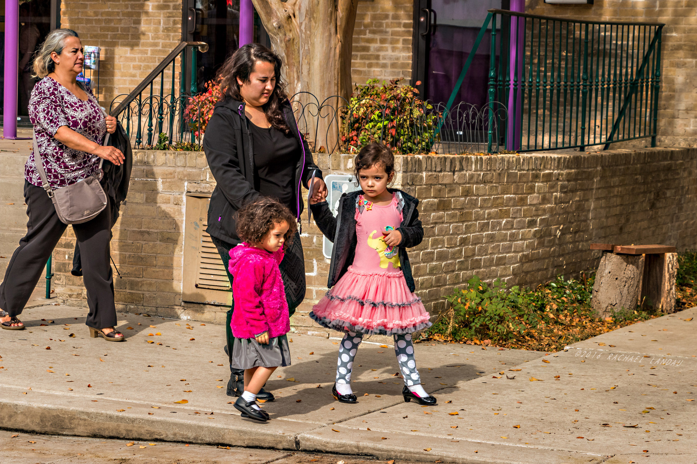 Grandmother or auntie is lagging behind a mother with her two young daughters. In the center of the frame is our main subject: the eldest of the girls who is wearing a pink dress. The little lady was watching other children running around the nearby play yard. Her body language and expression contained envy.